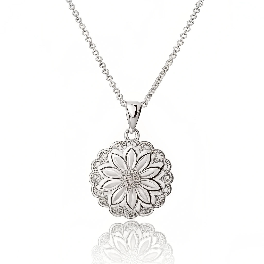 A silver medallion with an engraved floral motif on a simple chain.