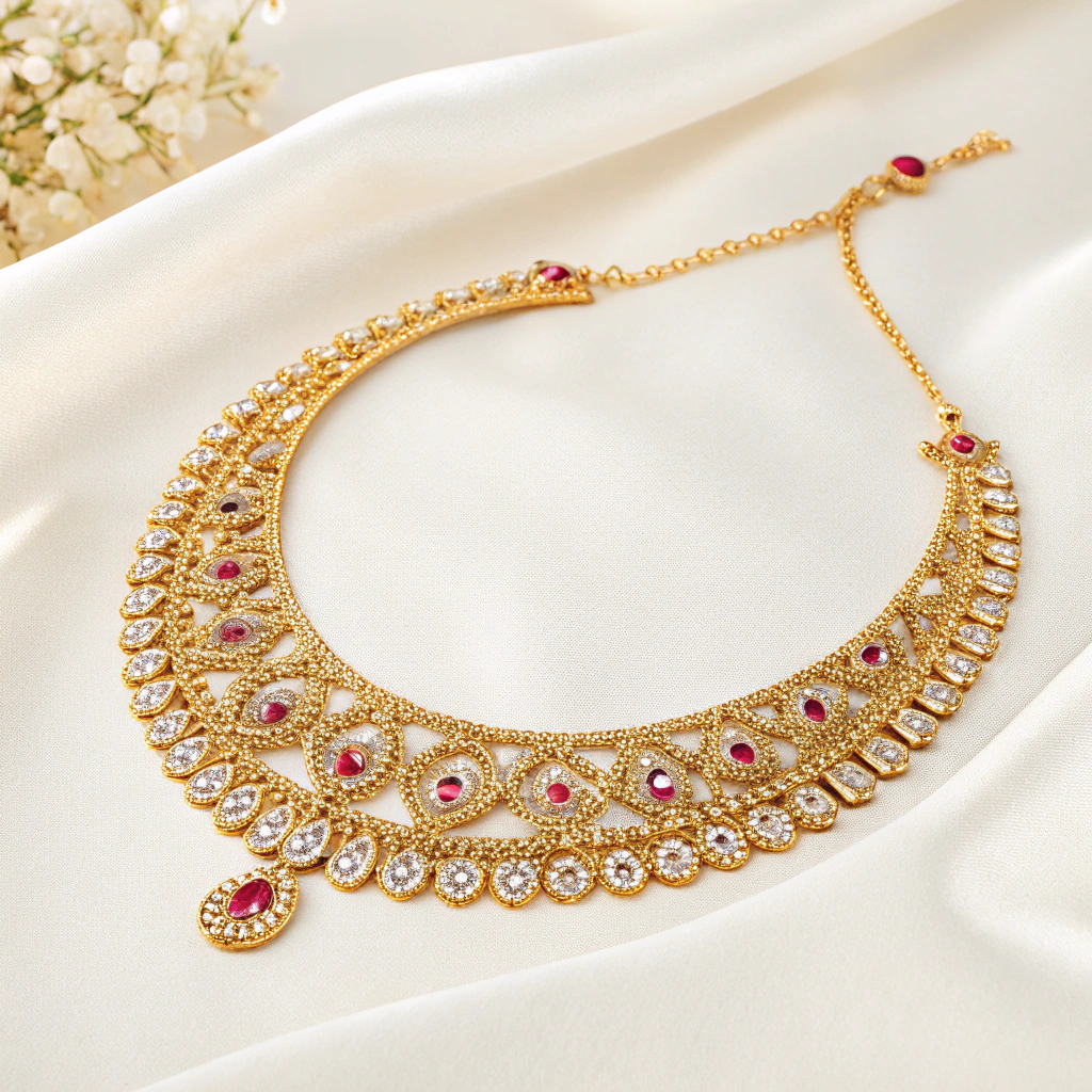 The Traditional Gold Choker Necklace showcases intricate craftsmanship with red and white stones, inspired by classic Indian jewelry. This bold piece is ideal for weddings, festivals, and celebrations, offering a regal look that complements traditional attire.